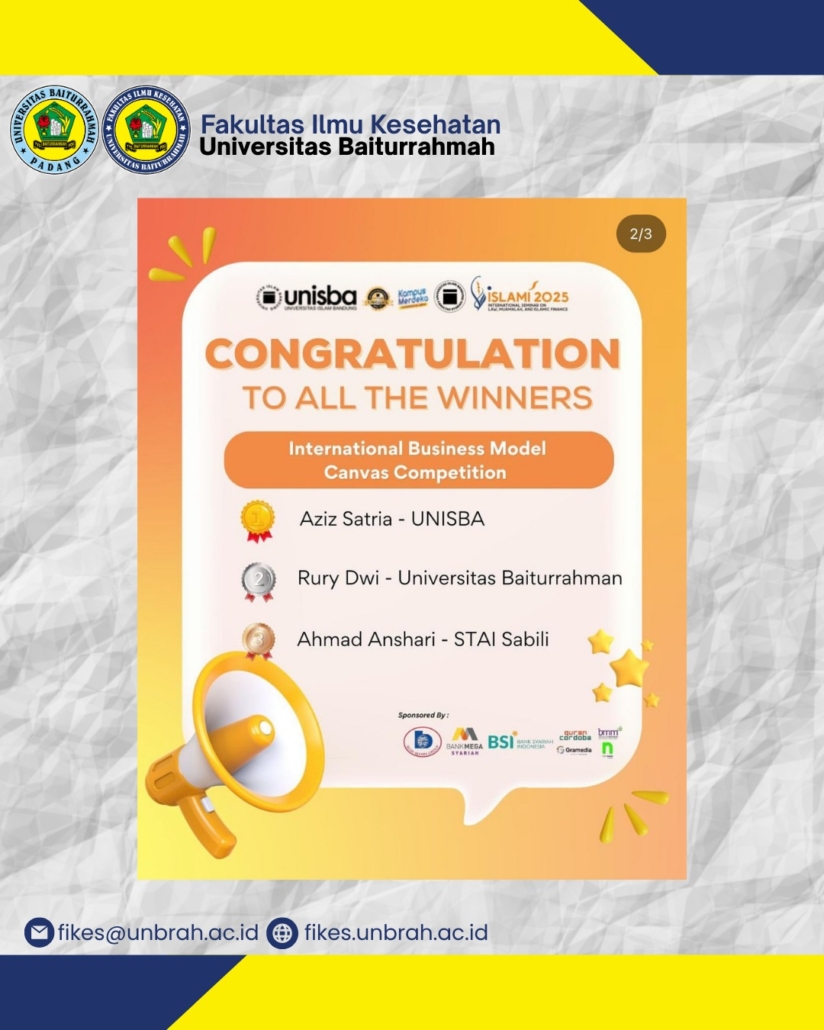 Padang – Mahasiswa Program Studi Farmasi Klinis Fakultas Ilmu Kesehatan Universitas Baiturrahmah (UNBRAH) kembali mengharumkan nama institusi di kancah internasional. Tim mahasiswa yang diketuai oleh Rury Dwi Aryanti dengan anggota Azura Puan Maharani berhasil meraih Juara 2 pada ajang Business Model Canvas (BMC) Competition yang diselenggarakan oleh Universitas Islam Bandung (UNISBA) pada bulan Juli 2025.