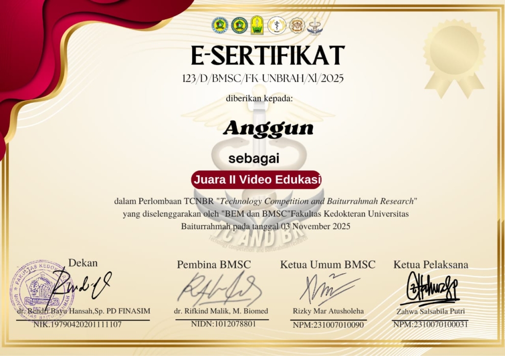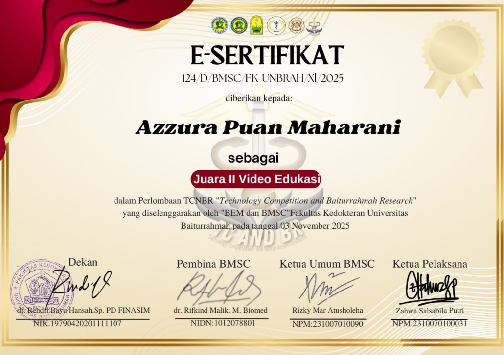 Selain prestasi pada kategori KTI, mahasiswa Farmasi Klinis UNBRAH juga berhasil meraih Juara 2 kategori Video Edukasi melalui tim yang terdiri dari Azura Puan Maharani, Anggun, dan Nurzahwa Henisara.