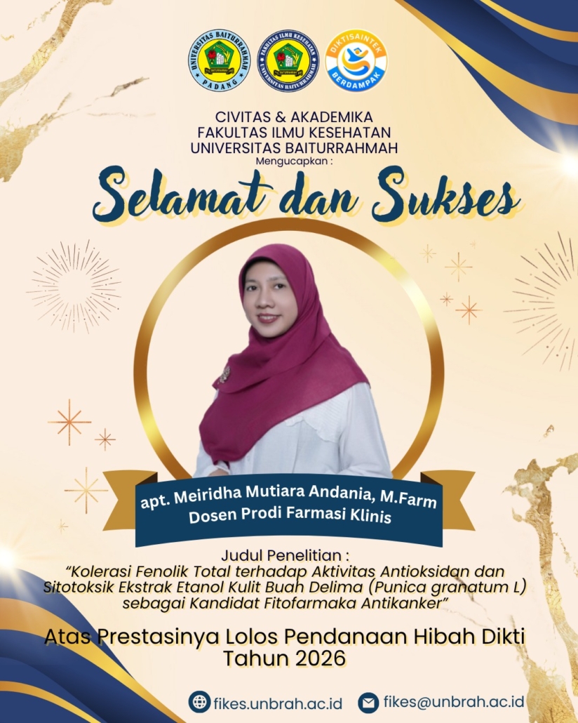 Padang – Dosen Program Studi Farmasi Klinis Fakultas Ilmu Kesehatan Universitas Baiturrahmah (UNBRAH) kembali menorehkan prestasi membanggakan di bidang akademik dan pengabdian kepada masyarakat. Pada tahun 2026, dua dosen Farmasi Klinis berhasil lolos pendanaan Hibah Penelitian Dosen Pemula dan Pengabdian kepada Masyarakat (PKM) dari DIKTI, sebagai bentuk pengakuan atas kualitas proposal dan kontribusi keilmuan yang diajukan.
